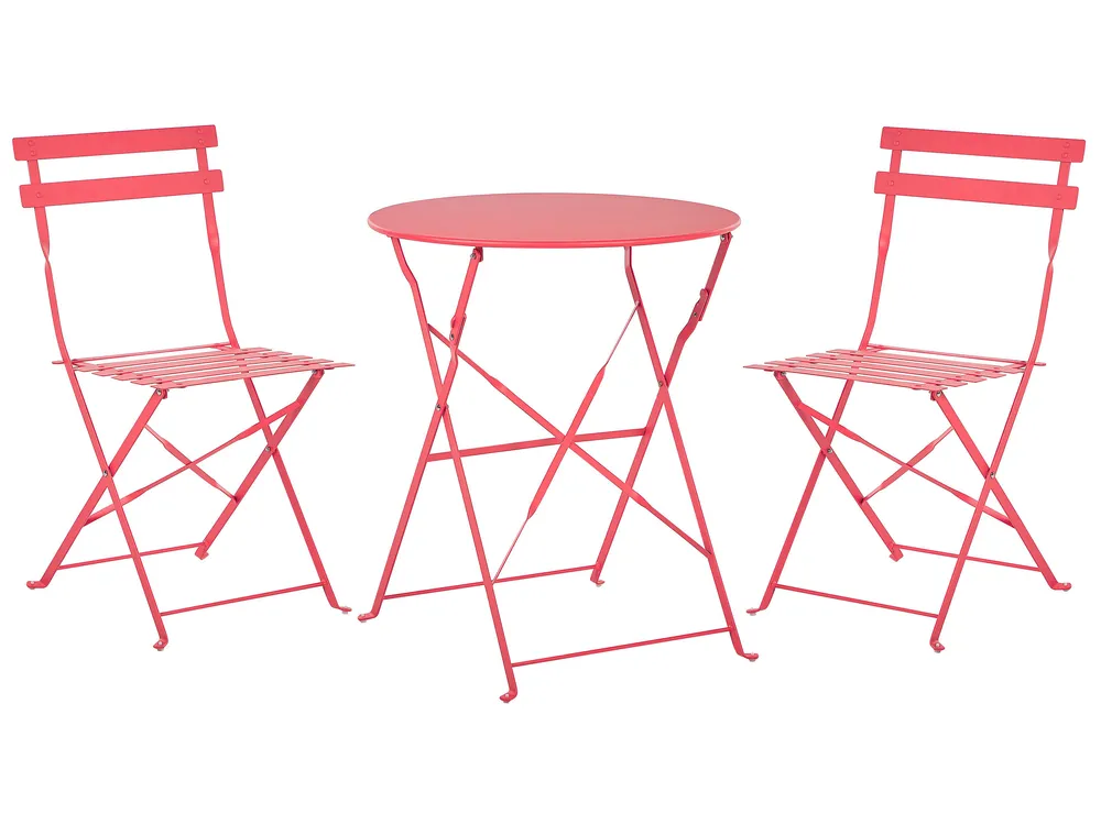 Table métallique avec 2 chaises rouges, pliantes